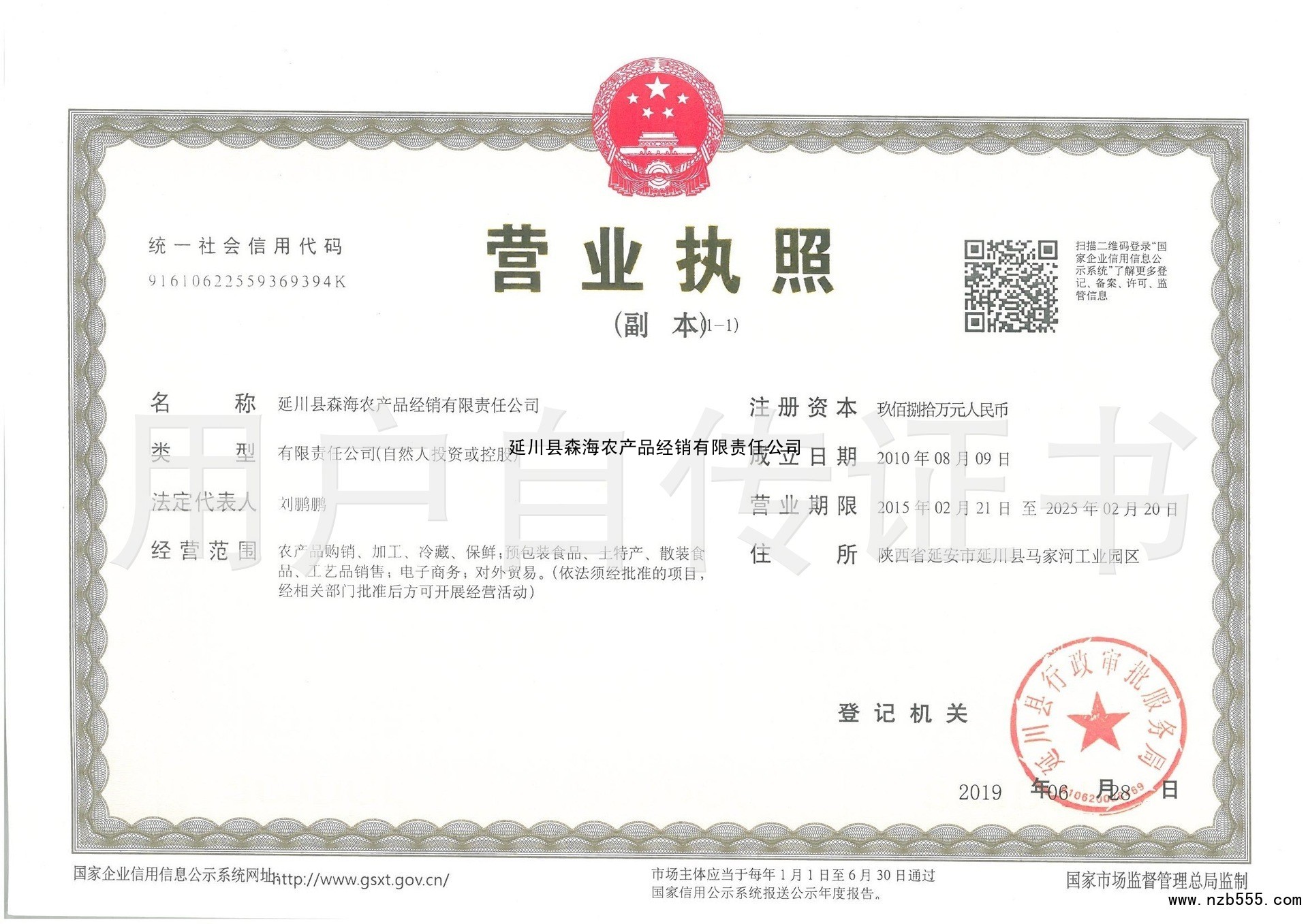 | 發(fā)證機(jī)構(gòu): | 延川縣行政審批服務(wù)局 | 發(fā)證時(shí)間 : | 2019-06-28 |