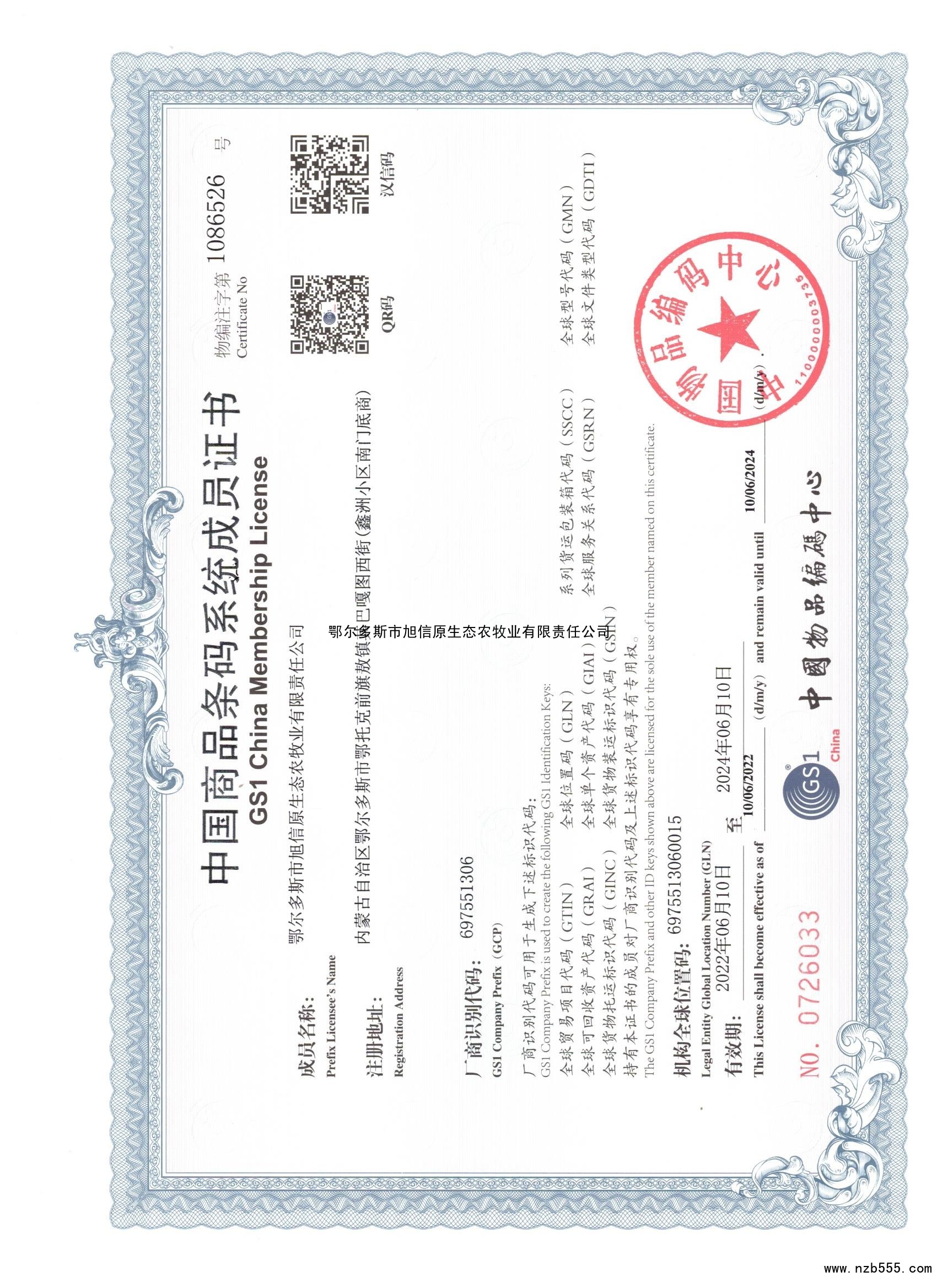 中國商品條碼系統成員證書