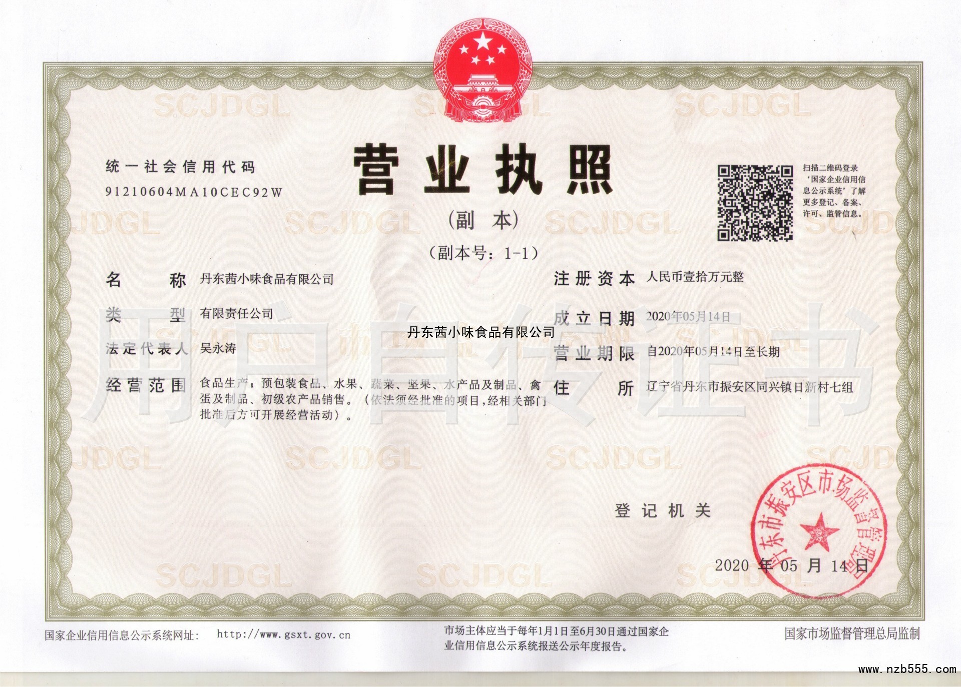 | 發(fā)證機(jī)構(gòu): | 丹東市振安區(qū)市場(chǎng)監(jiān)督管理局 | 發(fā)證時(shí)間 : | 2020-05-14 |