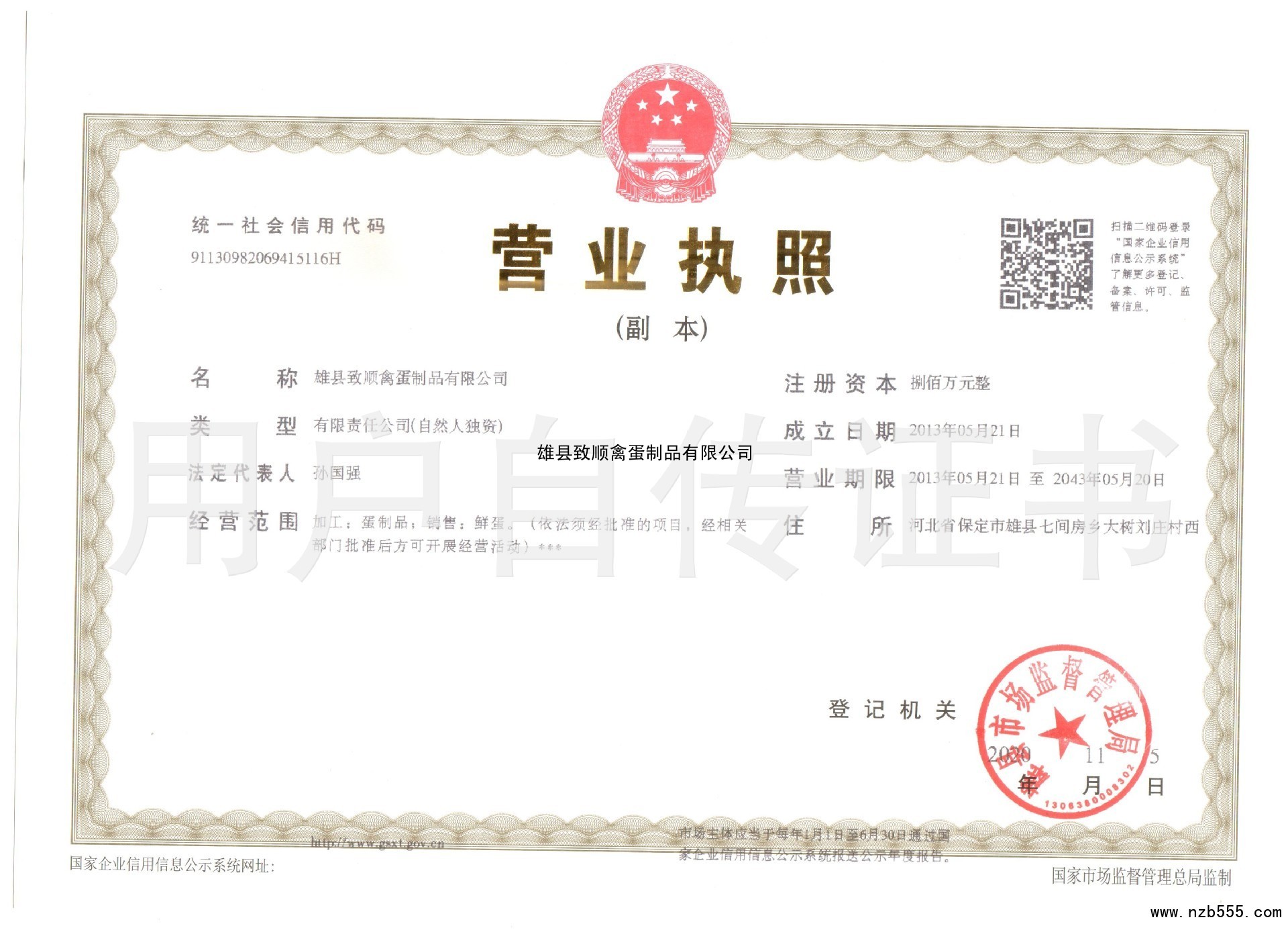 | 發(fā)證機(jī)構(gòu): | 雄縣市場(chǎng)監(jiān)督管理局 | 發(fā)證時(shí)間 : | 2020-11-05 |