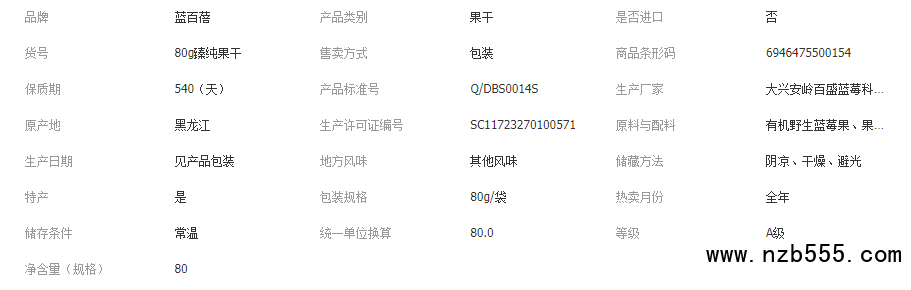 詳細(xì)信息 ![]() 品名:藍(lán)莓果干 凈含量 :80g 配料 :有機野生藍(lán)莓果、果葡糖漿、橄欖油 產(chǎn)品標(biāo)準(zhǔn)號 :Q/DBS 0014S 條碼 :6946475500154 生產(chǎn)許可證號:SC11723270100571 保質(zhì)期:18個月 生產(chǎn)日期:見封口 貯存條件:陰涼、干燥、避光 食用方法:直接食用